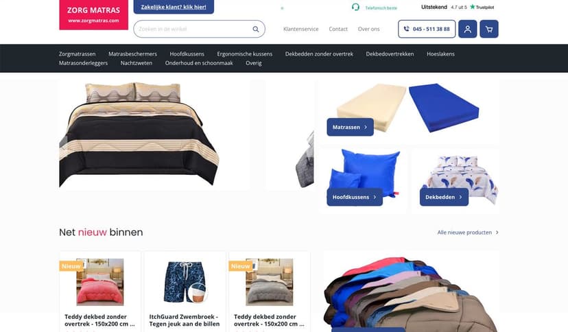 Toen Zorgmatras bij ons kwam draaiden ze nog op Magento 1 en die shop was end-of-life. De overstap naar Shopware 6 was dan ook volkomen logisch, echter was er reeds een andere partij bezig geweest met het bouwen van een nieuwe Shopware shop. Echter, door de hoge complexiteit van de producten van Zorgmatras is dit project vastgelopen en zijn wij aangehaakt om alles weer strak te trekken. Zo gezegd zo gedaan, en de Shopware shop draait inmiddels alweer dik een jaar.