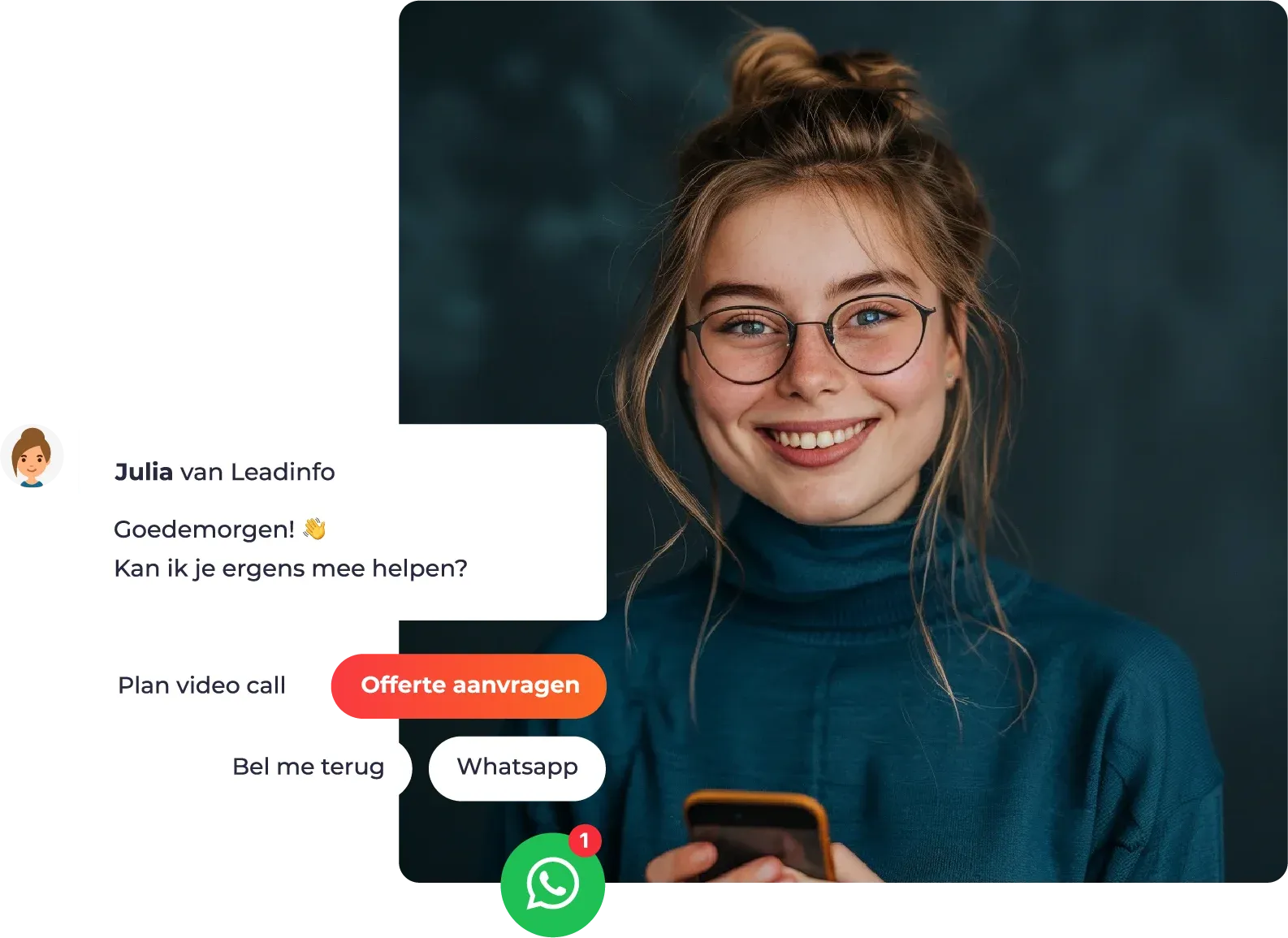 Veel knoppen worden niet gezien en contactformulieren zelden ingevuld. Maak je belangrijkste knoppen altijd zichtbaar voor veel meer conversies. Klanten kunnen binnen 10 seconden een offerte bij jou aanvragen, zodat je direct kunt reageren en meer deals kunt sluiten. Met de Contact bot bied je bezoekers de mogelijkheid om een vraag te stellen via WhatsApp, Telefoon of E-mail. Of om een Terugbelverzoek achter te laten of een Video Call in te plannen.